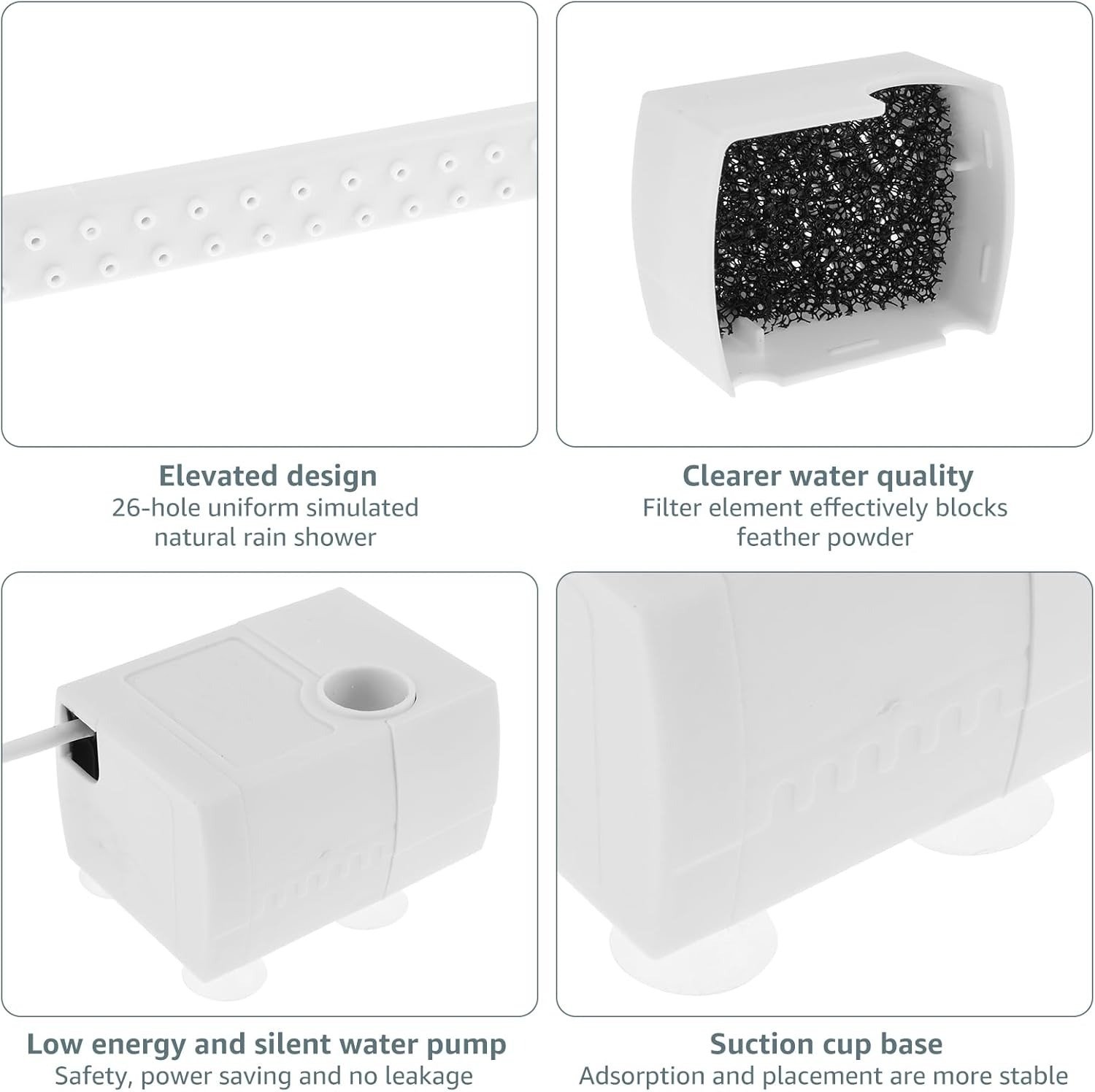 An elevated shower head creates soft, uniform rainfall that’s gentle on feathers and skin, perfect for timid birds. This design encourages natural bathing behavior, as many parrots prefer moving water.