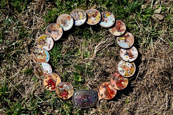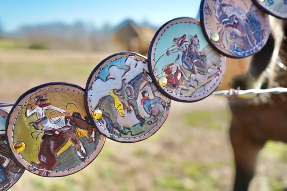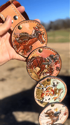 A statement waist belt inspired by the storytelling style of classic Western art. Each round panel features detailed illustrated scenes, creating a wearable piece that feels both artistic and bold.